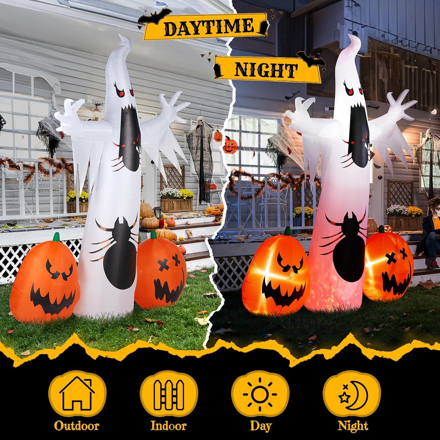 [SPOOKY Appearance Design]Our inflatable witches decoration is 3.2 ft long, 2.9ft wide, and 5.9 ft high. The cute Halloween decoration will also appeal to kids. This childlike décor is perfect for your friends as a gift. This gift will bring you joy and is ideal for your Halloween display.[Easy to Set up]All you need to do is close the zipper at the bottom and plug it in, the auto-inflatable will inflate in just a few seconds for convenience. The scary outdoor inflatable has bright built-in LED lights that look great at night and illuminate neighbors and guests nicely to attract them.[Durable and Stay up Easily] Our blow up light garden decoration is made of high quality fabric, lightweight and durable, easy to store after deflated and can be reused many times. The Halloween inflatable lawn decoration is equipped with ground stakes and ties to keep the tree in a stable condition. Our LED lighted home decor looks so pretty when it is inflated, and it will stay up. Keeping in high spirits, be perfect for indoor and outdoor use.[Widely Used]Our LED light-up decoration is perfect for Halloween patio decorations. The holiday inflatable can also be used as stage props , make your home patio extra scary, attract customers to your store.[Customer Service] We Offer You Best Customer Service, If You Have Any Questions, Please Feel Free to reach out. Our service team would provide 24-hour premium service to help solve any of the problems. Hope you have a great shopping experience.