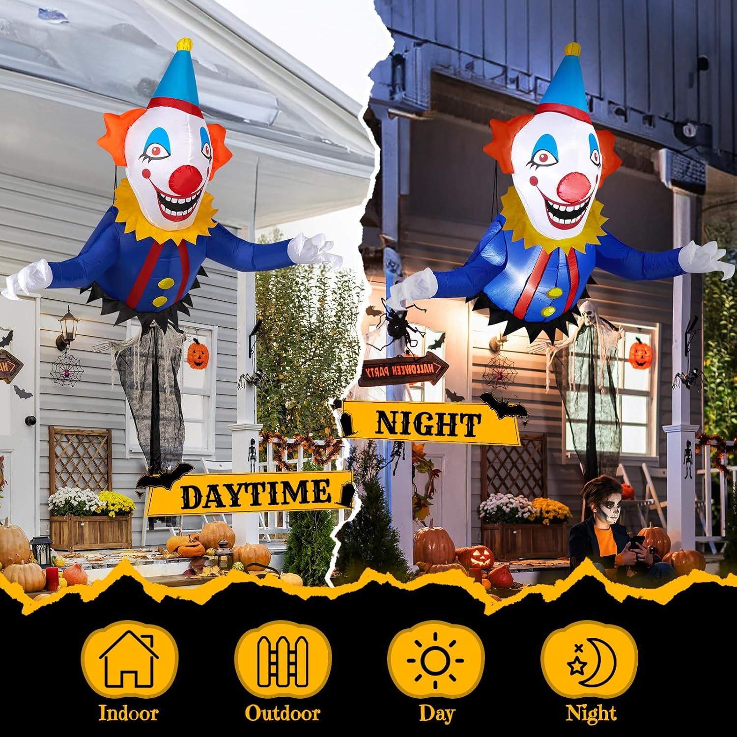 [SPOOKY Appearance Design]Our inflatable witches decoration is 3.2 ft long, 2.9ft wide, and 5.9 ft high. The cute Halloween decoration will also appeal to kids. This childlike décor is perfect for your friends as a gift. This gift will bring you joy and is ideal for your Halloween display.[Easy to Set up]All you need to do is close the zipper at the bottom and plug it in, the auto-inflatable will inflate in just a few seconds for convenience. The scary outdoor inflatable has bright built-in LED lights that look great at night and illuminate neighbors and guests nicely to attract them.[Durable and Stay up Easily] Our blow up light garden decoration is made of high quality fabric, lightweight and durable, easy to store after deflated and can be reused many times. The Halloween inflatable lawn decoration is equipped with ground stakes and ties to keep the tree in a stable condition. Our LED lighted home decor looks so pretty when it is inflated, and it will stay up. Keeping in high spirits, be perfect for indoor and outdoor use.[Widely Used]Our LED light-up decoration is perfect for Halloween patio decorations. The holiday inflatable can also be used as stage props , make your home patio extra scary, attract customers to your store.[Customer Service] We Offer You Best Customer Service, If You Have Any Questions, Please Feel Free to reach out. Our service team would provide 24-hour premium service to help solve any of the problems. Hope you have a great shopping experience.