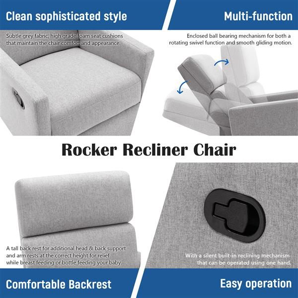 Modern Upholstered Rocker Nursery Chair Plush Seating Glider Swivel Recliner Chair, Gray