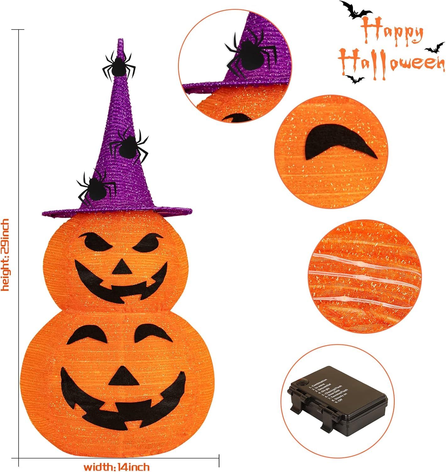 Trick or treat jack-o-lanterns to spice up your Halloween horror decorating. N&T NIETING Classic Halloween character and vivid expressions wearing on their face will definitely add your room some interesting festive touch.Cute pumpkin package includes collapsible stacked pumpkin*1(With Light), installation notes*1,DIY accessory*1,support column*2.​ Great for Halloween Themed Party, Halloween Indoor and Outdoor Decorations, or Halloween yard decoration!Our light up pumpkin is made of a durable metal frame and covered with soft and thickened fabric weaved with metallic yarns for a decorative look and feel. Outdoor pumpkin decor can be well fixed on the ground, which is super stable for outdoor use.This pumpkin decor has 75 LED LIGHTS AND 8 Lighted Up Mode, creates a glowing nighttime display and is easy to use.​ will brighten up your Halloween decor by creating an attractive focal point in your yard or porch.Pumpkin decorations come in a nice box that can be a Halloween gift for your family and friends. It can be used to decor your office, the living room, dining room or entryway. Great for Halloween, Eve party, ghost festival and other occasions, bring some horror atmosphere to the Hallowmas party.
